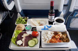 Cuisine raffinée avec un choix de plats chauds, desserts et vins fins. Boissons offertes pendant le vol.