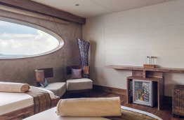 1 Cowrie Suite de 16 m2 se trouve également au pont inférieur. Elle est équipée d'un lit double et d'un canapé qui peut se convertir en lit d'appoint. Quatre hublots apportent de la lumière de chaque côté.
