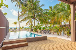 27 Water Front Villas d’environ 60 m2 se trouvent directement sur la plage, au bord de l’eau. Elles disposent d’une terrasse en bois sur le sable, et d’un bain à jets dans un jardinet clos, à l’arrière de la villa.