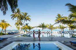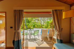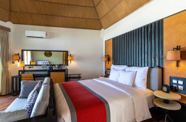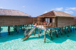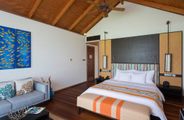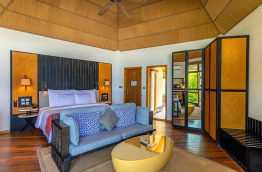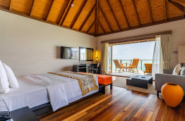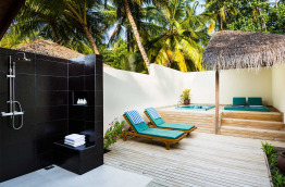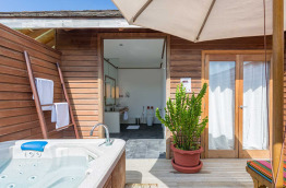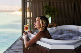 44 Water Villas avec bain à jets d’environ 85 m2 sont construites sur pilotis au-dessus du lagon, le long du ponton Sud-Est. Plus spacieuses, elles offrent une grande chambre avec un coin salon et une machine à expresso. La salle de bains donne sur une terrasse privative équipée d’un bain à jets, et offre un accès direct au lagon grâce à un petit escalier.