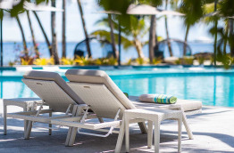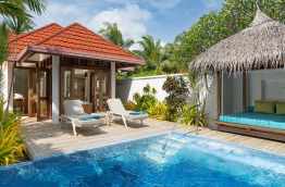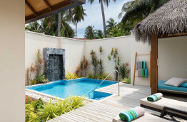 17 Deluxe Pool Villas (160 m2), offrent une situation les pieds dans le sable. Votre jardinet privé comprend une belle piscine, et une terrasse où vous pourrez profiter du soleil et vous relaxer en toute intimité. Côté plage, une grande terrasse aménagée vous invite au repos.