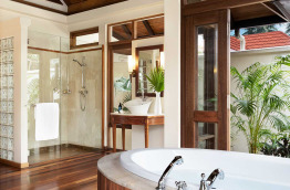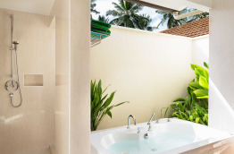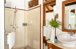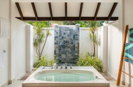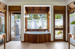 6 Beach Villas (103 m2) sont situées côté lever de soleil, dans la végétation, mais proches de la plage. Dans votre jardinet privé, vous bénéficierez d'une douche extérieure et d'un bain à jets.