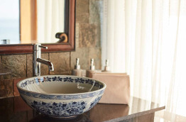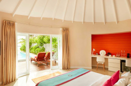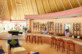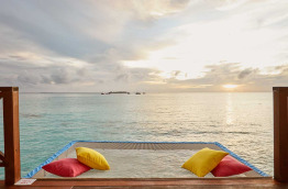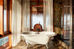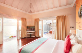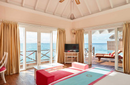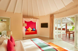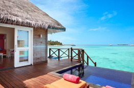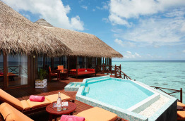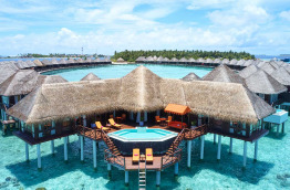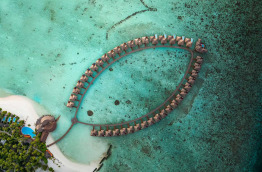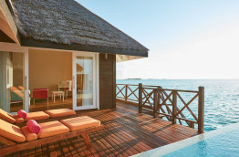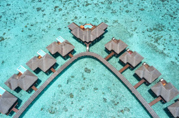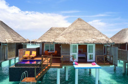 5 Grand Water Villas with Pool de 110 m2 sur pilotis offrent encore plus d’intimité. Équipées des mêmes facilités que les Reef Villas, elles ont en plus un hammam, et un salon indépendant avec des baies vitrées offrant une vue panoramique sur le lagon.