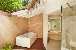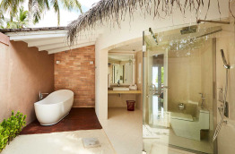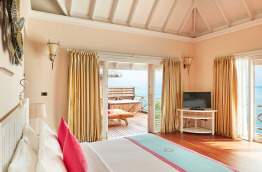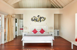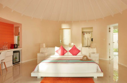 18 Deluxe Beach Villas et 10 Deluxe Beach Villas avec bain à jets se trouvent sur l’île. Elles sont de forme ronde, très spacieuses (76 m2) et pleines de charme. Proches de la plage, elles disposent d’un lit à baldaquin, d’un coin écriture, d’un dressing, d’une télévision, de grandes baies vitrées pour laisser passer la lumière, et d’une terrasse en bois avec vue sur le lagon. La salle de bains ouverte sur l'extérieur comprend une douche et une baignoire en plein air dans un jardin privatif. Les murs et le plafond sont blancs, et de gros coussins très colorés dans une alcôve viennent donner de la gaieté à l'ensemble.