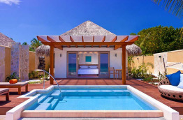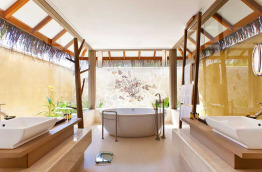 4 Villas (84 m2) et 1 Suite (149 m2), toutes sur pilotis, disposent de toutes les facilités des Water Bungalows, la Suite comprend en plus un bain à jets de plein air.