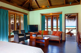 52 Water Bungalows (54 m2) sur pilotis au-dessus du lagon. Leur terrasse privée avec accès direct à la mer, vous permet de prendre un bain de soleil et d’apprécier l’air pur et la vue infinie sur l’océan. Un lecteur DVD est à votre disposition, la spacieuse salle de bains offre une superbe vue sur la mer et une porte vous donne un accès direct à votre terrasse.