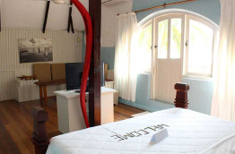 Le Faro Studio de 50 m2 est situé sur la plage, entouré de hauts palmiers. Il se trouve au-dessus du bar-café, et s’étend sur deux étages : au rez-de-chaussée, vous trouverez le lit king-size, la salle de bains, l’espace salon et la terrasse avec chaises longues. Sur la mezzanine se trouvent deux lits simples, parfaits pour deux enfants.