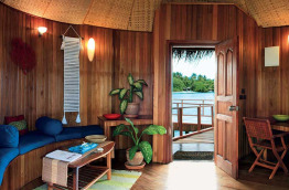 8 Water Villas, offrant 110 m2 de superficie : une chambre avec lit king-size, un salon, une salle de bains, un solarium à l’étage et une terrasse avec accès direct à la mer. Elles sont situées dans le lagon et peuvent accueillir 3 personnes.