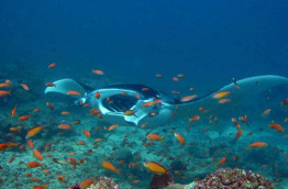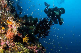 La plongée libre est un des autres points forts de Nika. En effet, vous pourrez accéder au récif qui ceinture l’île directement depuis la plage avec vos palmes. Vous pouvez également partir de la jetée où accostent les hydravions et vous serez directement sur le tombant ; il n’est pas rare d’observer de gros poissons passer dans le chenal, et vous verrez à coup sûr des tortues, une multitude de poissons tropicaux, ainsi que de jolies formations coralliennes.