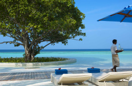 Une immense piscine à débordement de 750 m2 est posée en bord de plage avec, en son centre, un immense banyan.
