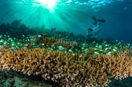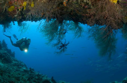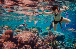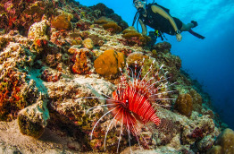 L’île est entourée d’un magnifique récif corallien en excellent état. La mise à l’eau directement depuis la plage à marée haute, ou depuis l’une des jetées, vous assure de belles surprises sous-marines. Le tombant est recouvert d’une grande quantité de coraux durs, corail cerveau, tables d’acropora, corne de cerf, mais aussi de superbes gorgones, et coraux mous multicolores. De gros bancs de carangues, gaterins, fusiliers, vivaneaux, et une multitude de poissons tropicaux, dont des murènes, habitent le récif. Vous croiserez probablement des tortues, raies aigles, raies pastenagues, platax, barracudas.