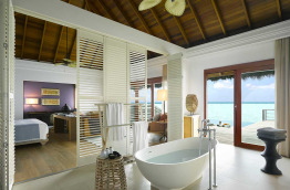 20 Overwater Pool Villas sont construites sur 180 m2, sur pilotis au-dessus du lagon. Vous pouvez accéder au lagon directement depuis votre spacieuse terrasse privative équipée d’une piscine privée d’eau douce, d’un coin salon pour profiter des extérieurs, et de deux chaises longues. La salle de bains est immense et, depuis votre baignoire, vous pourrez contempler l’immensité de l’océan.