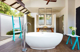 Elles bénéficient notamment d’une superbe salle de bains extérieure dans un jardinet, comprenant une douche de plein air en plus de la douche intérieure. Elle comprend deux vasques, ainsi qu’une baignoire d’où vous pourrez sentir l’air tropical sur votre peau pendant que vous vous détendez dans votre bain.