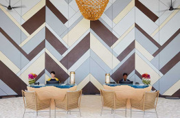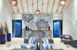Quand on débarque sur la jetée, on est accueilli dans un magnifique espace de réception, les pieds dans le sable, très haut de plafond et largement ouvert sur l’extérieur. La décoration est chic et sobre, tout comme le reste de l’hôtel.