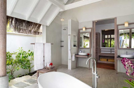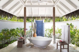 29 Sunrise Beach Villa de 70 m2 situées sur la plage au soleil levant, avec lit king-size, salle de bains ouverte sur l’extérieur avec douche intérieure et extérieure, terrasse extérieure aménagée de 55 m2 et baignoire en terrazzo pour deux, en plein air.