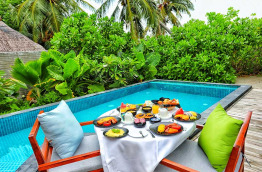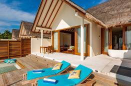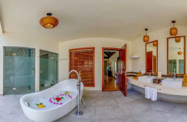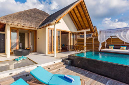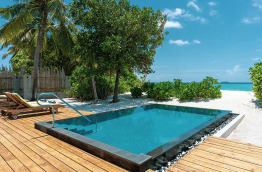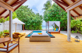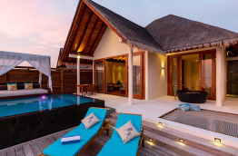 Les 10 Beach Pool Villas avec bain à jets d’environ 200 m2 se trouvent sur la côte Est de l’île. Leur architecture rappelle le design d’un bateau traditionnel maldivien du même nom, et leur salle de bains entièrement vitrée donne sur un jardin privé. Ces villas sont entourées d’une végétation luxuriante d’un côté, et offrent une vue sur le sable blanc et le lagon de l’autre. Elles sont aussi équipées d’une piscine privée en forme de gouvernail de dhoni, ainsi que d’un bain à jets extérieur.