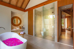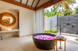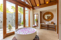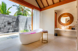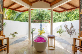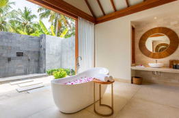 25 Garden Villas sont nichées dans les jardins, légèrement en retrait de la plage. Elles n’ont pas le charme des villas proches de l’eau. D’une superficie d’environ 110 m2, elles disposent d’un lit king-size, d’une salle de bains semi-extérieure et d’une grande terrasse agréable à toute heure de la journée. Ces villas peuvent accueillir jusqu’à 2 adultes et 2 enfants, et certaines sont communicantes : il est possible d’en louer deux, côte à côte, pour créer un plus grand hébergement.
