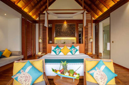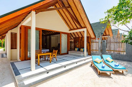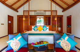 Le long de la plage Nord de l’île se trouvent 40 Beach Villas. Elles disposent d’un agréable lit king-size installé face à la baie vitrée. Sur votre terrasse privée, profitez de chaises longues et d’une table à l’ombre des palmiers. La salle de bains semi-extérieure est très agréable, avec sa douche et sa grande baignoire. Cette villa d’environ 125 m2 peut accueillir 2 adultes et 2 enfants ou 3 adultes.