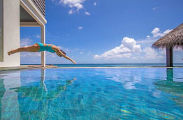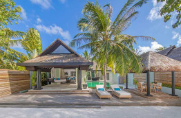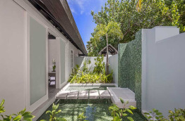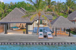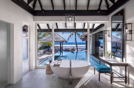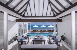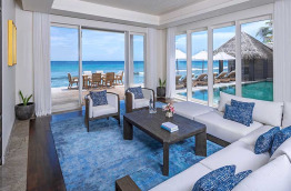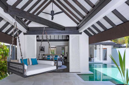 1 Two Bedroom Beach Pool Residence s’étend sur deux étages, offrant une superficie totale de 600 m2. Elle compte une chambre et une salle de bains sur chacun des niveaux, ainsi que de vastes espaces communs. Sa terrasse se trouve juste au-dessus de la mer. On ne peut pas se baigner depuis la terrasse, mais la villa donne accès à une plage privée.
