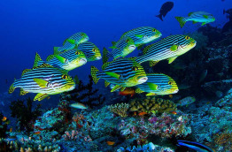 Le snorkeling est facilement accessible tout autour de l’île, mais particulièrement depuis la pointe Est où vous pourrez chausser vos palmes et partir depuis la plage pour explorer le récif qui ceinture l’île de Vakkaru. À l’extrémité Ouest, c’est depuis la jetée des pilotis que l’on accède à une très jolie partie du récif. Comme partout ailleurs aux Maldives, les récifs ont considérablement souffert du blanchiment, mais la faune est toujours abondante, et vous serez surpris de la quantité de poissons présents, souvent en grands bancs.