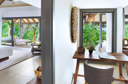 5 Overwater Pool Villas de 200 m2 qui peuvent se réserver pour un couple qui cherche plus d’espace et souhaite une piscine privée sur la terrasse. Comme les précédentes, tout est largement ouvert sur le lagon et elles disposent en plus d’un petit salon de lecture.