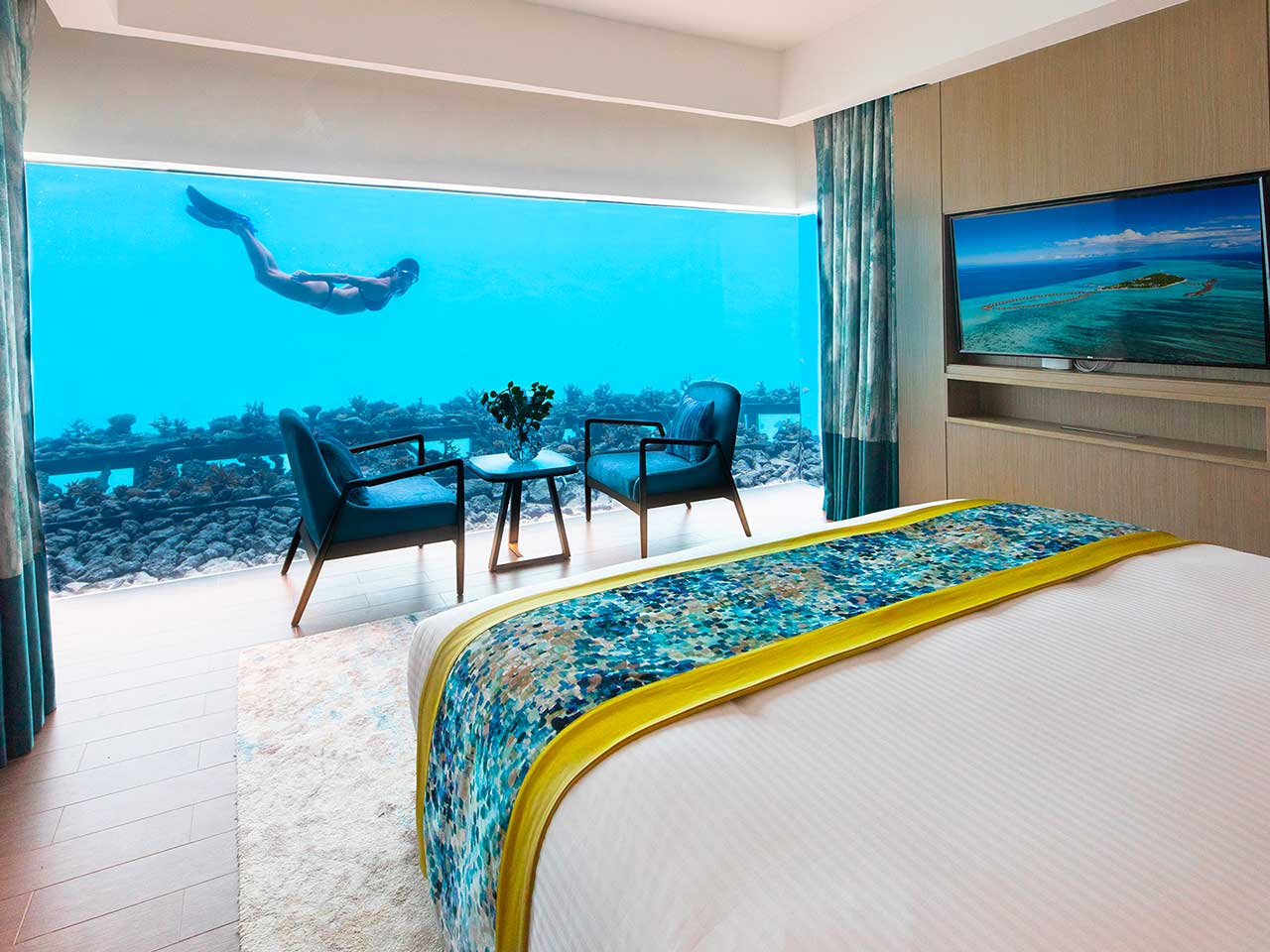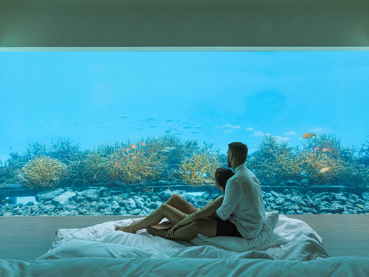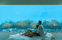 2 Aqua Villas offrent un concept exceptionnel : celui de séjourner sous l’eau. Ces villas d’environ 209 m2 sont en effet composées d’une chambre, d’une salle de bains, d’un salon et d’une terrasse à l’étage principal, et d’une seconde chambre immergée sous l’eau à l’étage inférieur. Ses occupants pourront donc contempler la vie sous-marine directement depuis le confort de leur lit.