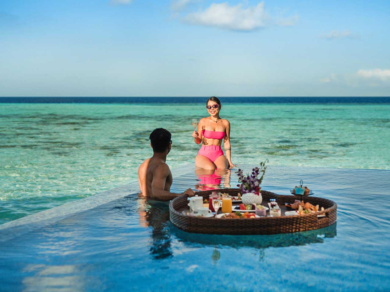 Pour la baignade, en plus du lagon, vous aurez le choix entre deux piscines : la première sur la plage près du restaurant principal, et la seconde sur la jetée Est au bord du bar-restaurant Sol Rising.