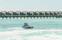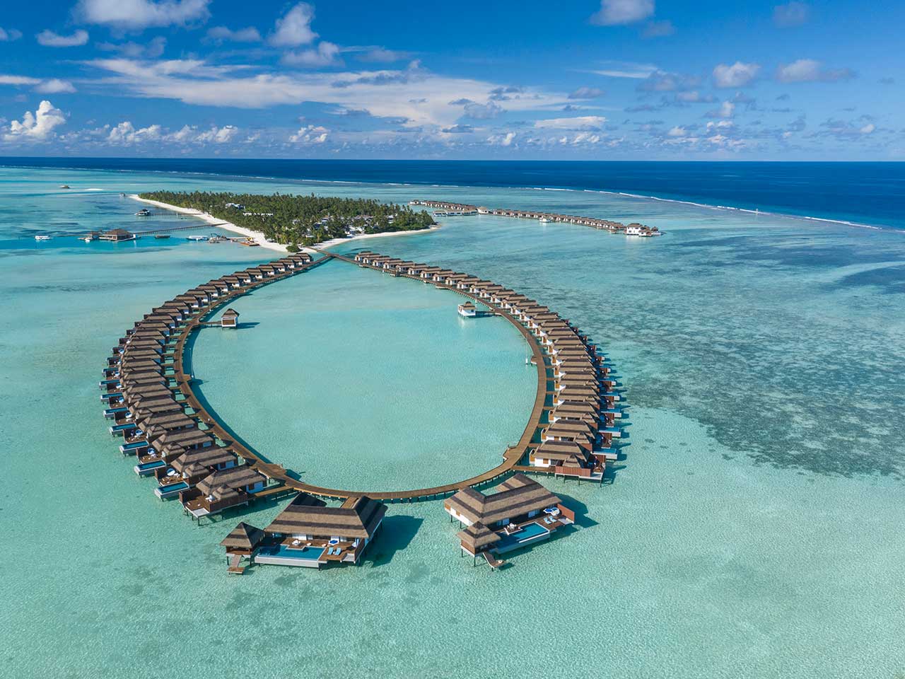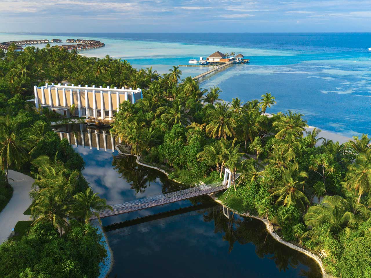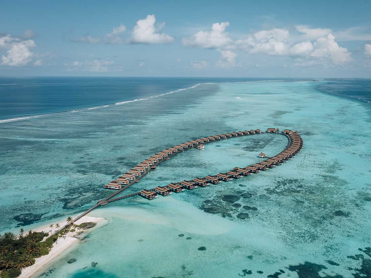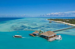 L’île compte également deux jetées, le long desquelles sont alignées 81 villas sur pilotis. La première jetée se trouve sur la côte Est. En plus des villas, il y a aussi un restaurant, un bar et le spa. La seconde jetée est située à l’extrémité Sud de l’île. Les villas se trouvant ici sont un peu plus loin des restaurants et autres infrastructures de l’hôtel, mais offrent davantage de calme. Certaines sont même parfaitement orientées pour regarder le coucher de soleil.
