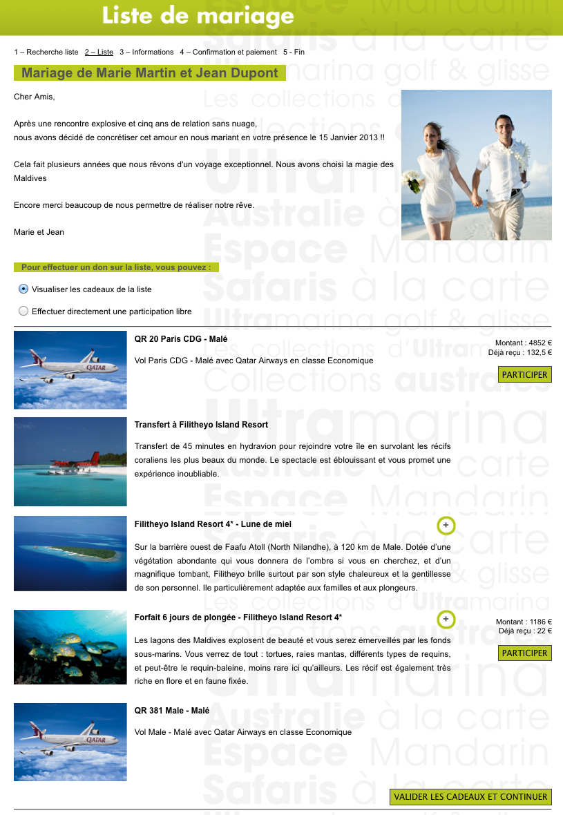 Présentez votre voyage de noces aux Maldives sous forme d’une liste de mariage ou de Pacs. Vos amis et votre famille pourront participer et vous aider à réaliser le voyage de votre vie.