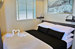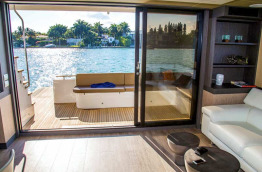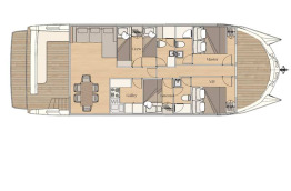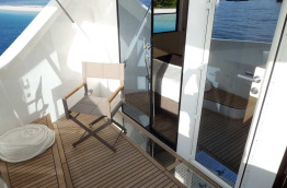 | Aménagements cabines | 2 cabines doubles, et 1 cabine avec un lit simple et un lit pliant superposé. Les cabines doubles se trouvent dans la proue, et disposent de baies vitrées donnant sur la terrasse à l’avant du bateau. L’une d’entre elles dispose de sa propre salle de bains privative, tandis que l’autre partage des sanitaires avec la troisième cabine. Chaque cabine possède une fenêtre, et est équipée de l’air conditionné. Draps de bains et peignoirs sont fournis, de même que les serviettes de plage. |