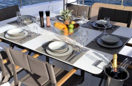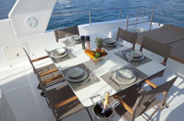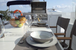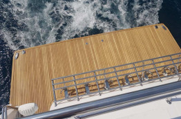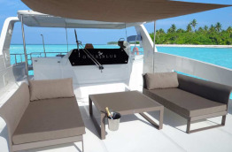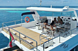 | Aménagements bateau | Pont arrière équipé pour la plongée et pour la pêche. Le pont supérieur est équipé d’un barbecue, de canapés, de chaises longues, d’une table à manger et d’un auvent. Une télévision est accessible dans le salon commun. Accès internet Wi-Fi gratuit à bord. |