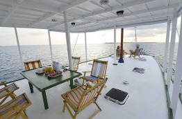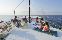 |Votre bateau|Gahaa|| |Type|Dhoni en bois de 21,58 m x 6,10 m. Construit en 1990|| |Capacité|10 personnes - 4 membres d’équipage|| |Aménagements cabines|4 cabines doubles avec couchettes superposées. 1 cabine double avec un lit double et un lit simple. Serviette de toilette, ventilateur dans toutes les cabines. 2 douches et toilettes.|| |Armement bateau|Moteur de 190 CV Vitesse : 7 nœuds. Annexe : 1 bateau. Electricité : 220 V. Eau douce : désalinisateur. GPS-radar-VHF, téléphone mobile.|| |Aménagements bateau|Carré principal avec salle à manger, bar et coin salon avec TV, DVD, hi-fi. Sundeck sur le pont supérieur avec solarium.|| |Equipement plongée|Plongée en supplément, service à réserver à l’avance.|| |Nombre de plongées par jour|2 avec supplément|| |Niveau requis|CMAS 1* - PADI OWD. Débutants acceptés, possibilité de formations PADI à bord. || |Itinéraire|Sur demande : Male Nord, Ari, Felidu, Male Sud. Autres atolls éloignés avec supplément.|| |Langues parlées|Anglais|| |Infos pratiques|Paiement en cash (EUR, USD) accepté.|| |Pendant la croisière|Activités possibles à bord : snorkeling (matériel fourni), excursions terrestres, pêche. ||