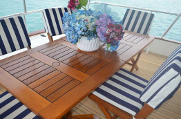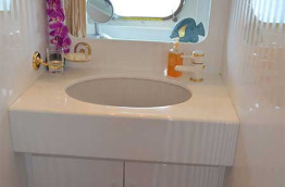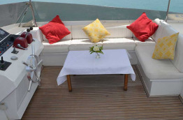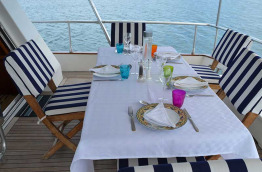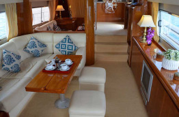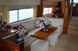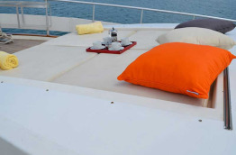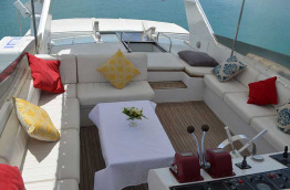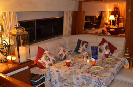 | Aménagements bateau | Grand carré avec salle à manger, salon, espace TV, chaîne Hi-Fi, films. Pont arrière pour les repas à l’extérieur, table pour 8 personnes. Sundeck, flybridge pour bronzer, pour les cocktails et dîners aux chandelles. Matelas à l’avant du yacht pour les bains de soleil. |