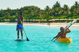 Avec participation : kayak à fond de verre, stand-up-paddle, planche à voile, kitesurf, catamaran, cours privé de yoga, cours de cuisine maldivienne, sorties snorkeling en bateau sur le récif, prestations de plongée sous-marine, sorties en mer pour la pêche ou la découverte des îles voisines dans l’atoll, randonnées pédestres, safaris à la rencontre des dauphins, raies manta, requins-baleines...
