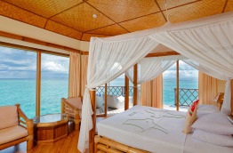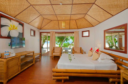 17 Water Bungalows de 56 m2 sont construits sur pilotis, sur le ponton du Sud de l’île. Plus luxueux, la salle de bains est équipée d’une baignoire, et la chambre d’un lit à baldaquin. La terrasse donne un accès direct à la mer.