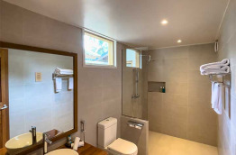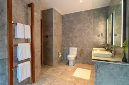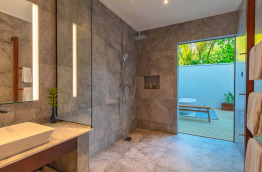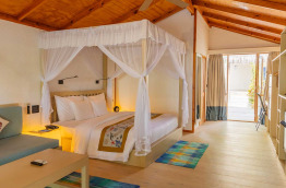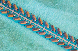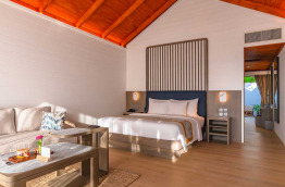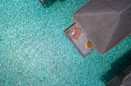 44 Water Villas avec bain à jets d’environ 85 m2 sont construites sur pilotis au-dessus du lagon, le long du ponton Sud-Est. Plus spacieuses, elles offrent une grande chambre avec un coin salon et une machine à expresso. La salle de bains donne sur une terrasse privative équipée d’un bain à jets, et offre un accès direct au lagon grâce à un petit escalier.