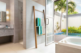 17 Deluxe Pool Villas (160 m2), offrent une situation les pieds dans le sable. Votre jardinet privé comprend une belle piscine, et une terrasse où vous pourrez profiter du soleil et vous relaxer en toute intimité. Côté plage, une grande terrasse aménagée vous invite au repos.