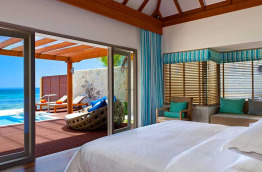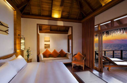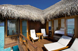 52 Water Bungalows (54 m2) sur pilotis au-dessus du lagon. Leur terrasse privée avec accès direct à la mer, vous permet de prendre un bain de soleil et d’apprécier l’air pur et la vue infinie sur l’océan. Un lecteur DVD est à votre disposition, la spacieuse salle de bains offre une superbe vue sur la mer et une porte vous donne un accès direct à votre terrasse.