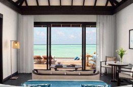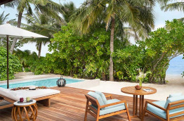 6 Beach Pool Villas d’environ 139 m2 sont les plus vastes de l’hôtel. Construites en 2022, elles offrent une douche extérieure, ainsi qu’une grande terrasse avec piscine privée et vue sur la mer. Elles sont situées directement sur la plage et bénéficient donc d’un accès direct au lagon depuis la terrasse.