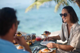Le bar Dhoni est niché en bordure de lagon, près de la piscine. Il propose une carte simple composée de plats légers et en-cas pour le déjeuner.