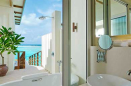 19 Overwater Villas de 85 m2, sur pilotis, offrent une baignoire extérieure, une salle de bains très lumineuse avec vue sur la mer et douche intérieure. La terrasse en bois au niveau de l’eau est spacieuse, équipée de transats et d’un accès direct au lagon, ainsi que d’un filet tendu (comme dans les catamarans) pour vous sentir encore plus proches de l’eau.