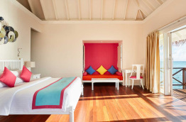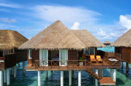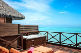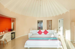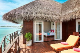 5 Grand Water Villas with Pool de 110 m2 sur pilotis offrent encore plus d’intimité. Équipées des mêmes facilités que les Reef Villas, elles ont en plus un hammam, et un salon indépendant avec des baies vitrées offrant une vue panoramique sur le lagon.