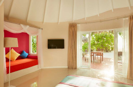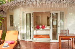 18 Deluxe Beach Villas et 10 Deluxe Beach Villas avec bain à jets se trouvent sur l’île. Elles sont de forme ronde, très spacieuses (76 m2) et pleines de charme. Proches de la plage, elles disposent d’un lit à baldaquin, d’un coin écriture, d’un dressing, d’une télévision, de grandes baies vitrées pour laisser passer la lumière, et d’une terrasse en bois avec vue sur le lagon. La salle de bains ouverte sur l'extérieur comprend une douche et une baignoire en plein air dans un jardin privatif. Les murs et le plafond sont blancs, et de gros coussins très colorés dans une alcôve viennent donner de la gaieté à l'ensemble.