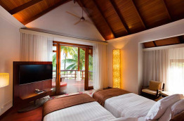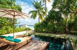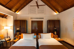 1 Beach Villa 2 Bedrooms est composée de deux chambres avec un lit king-size, chacune dotée de sa propre salle de bains et de sa piscine privative. Les chambres sont reliées par un salon commun et une terrasse face à la mer. Cette villa est idéale pour accueillir deux couples, ainsi que deux enfants de moins de 13 ans dans des lits supplémentaires.