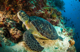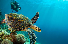 L’île est entourée d’un magnifique récif corallien en excellent état. La mise à l’eau directement depuis la plage à marée haute, ou depuis l’une des jetées, vous assure de belles surprises sous-marines. Le tombant est recouvert d’une grande quantité de coraux durs, corail cerveau, tables d’acropora, corne de cerf, mais aussi de superbes gorgones, et coraux mous multicolores. De gros bancs de carangues, gaterins, fusiliers, vivaneaux, et une multitude de poissons tropicaux, dont des murènes, habitent le récif. Vous croiserez probablement des tortues, raies aigles, raies pastenagues, platax, barracudas.