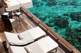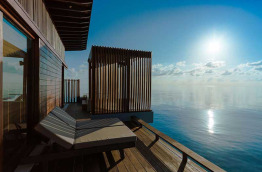 7 Overwater Sunset Pool Villas de 115 m2, qui sont similaires aux précédentes. Elles sont situées à l'extrémité de la jetée et vous garantissent une intimité encore plus grande et un magnifique panorama au coucher de soleil. En outre, la terrasse comprend quelques aménagements supplémentaires par rapport à la classique Park Water Villa.