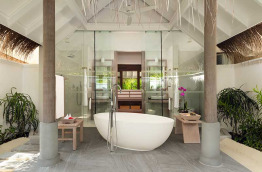 29 Sunrise Beach Villa de 70 m2 situées sur la plage au soleil levant, avec lit king-size, salle de bains ouverte sur l’extérieur avec douche intérieure et extérieure, terrasse extérieure aménagée de 55 m2 et baignoire en terrazzo pour deux, en plein air.
