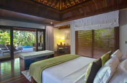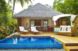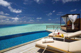 15 Water Pool Villas (126 m2) sont installées en bout de jetée, face au soleil couchant. Elles bénéficient d’une terrasse plus spacieuse équipée d’une petite piscine de 6,6 m x 3,6 m.