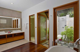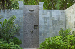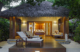 23 Deluxe Beach Villas (89 m2) profitent d’une salle de bains ouverte sur l’extérieur, avec douche extérieure et intérieure. Elles bénéficient également d'une terrasse avec transats et vue sur la mer.
