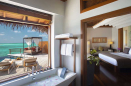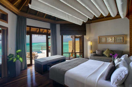 15 Water Villas (92 m2) sont similaires aux Baros Villas dans l’aménagement, mais sans douche extérieure. Depuis votre salle de bains intérieure, vous pourrez cependant observer la mer. Construites sur pilotis au-dessus du lagon, elles ont une grande terrasse équipée de transats et d'un canapé extérieur, offrant un accès direct à la mer.